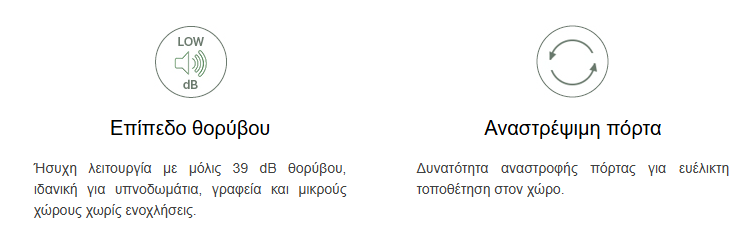 - Αθόρυβη λειτουργία, που το καθιστά κατάλληλο ακόμη και για υπνοδωμάτια ή επαγγελματικούς χώρους.