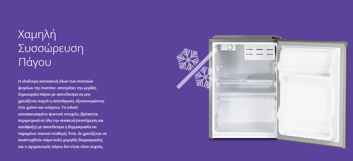 - Χαμηλή συσσώρευση πάγου χάρη στη σταθερή θερμοκρασία που διατηρεί η συσκευή